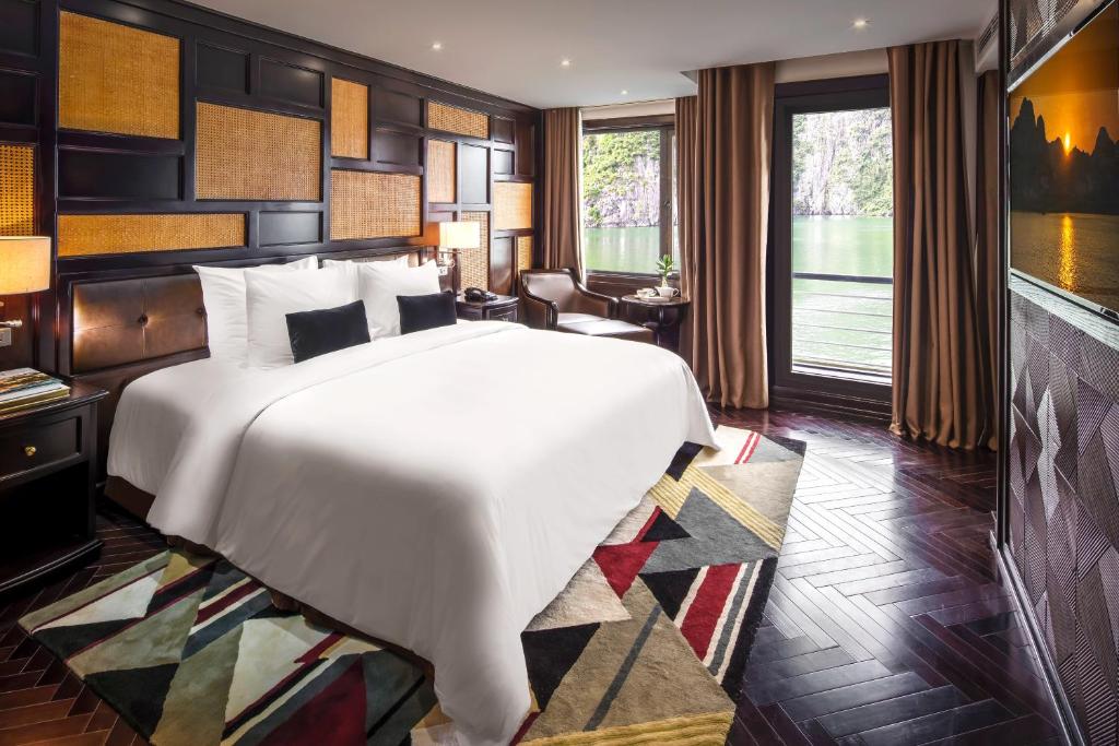 • Luxurious rooms with private balconies and panoramic views: All rooms on the cruise ship feature private balconies, large windows, and luxurious bathtubs, offering a private and comfortable space for relaxation, allowing guests to enjoy the stunning scenery of Ha Long Bay.