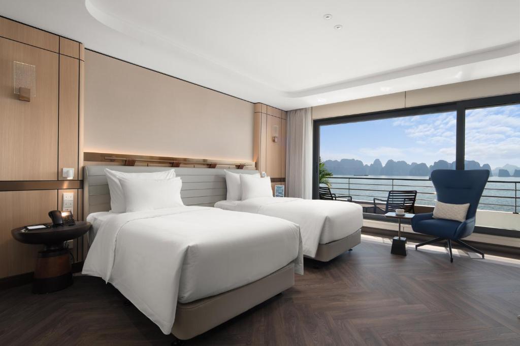 The Grand Pioneers (Essence Grand Cruise) boasts 55 elegantly designed, luxurious, and comfortable ocean-view cabins. You can choose from eight premium room categories, ranging from a standard 45m˛ room to a 150m˛ Owner Suite, complete with a hot tub, sun loungers, and a private helipad. All rooms feature private balconies offering breathtaking views of the heritage bay. You can also enjoy the scenery through the ship's large glass windows, providing a close connection with nature.