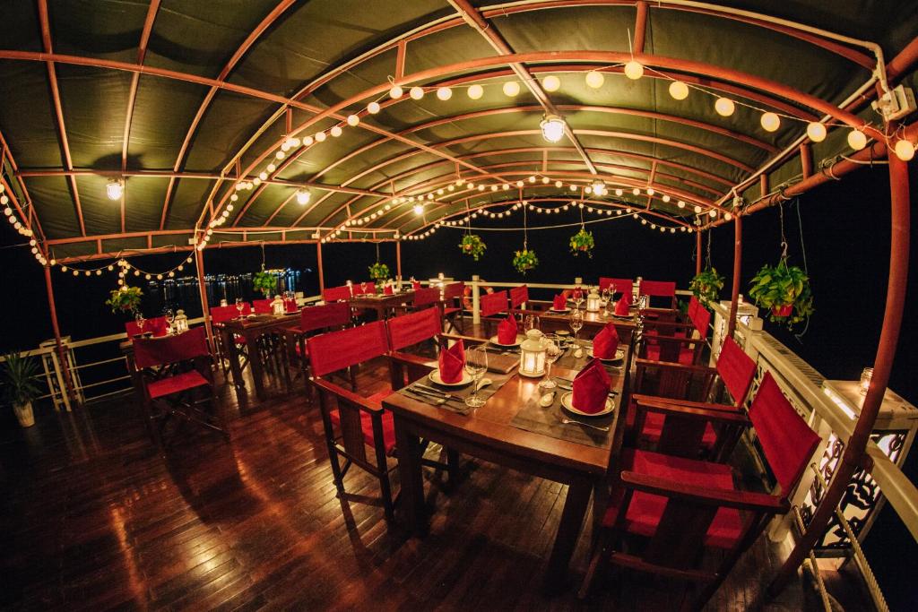 The cruise ship not only has an impressive space but also a system of 11 modernly designed cabins, fully meeting the needs of tourists. The rooms are divided into 3 types: Deluxe, Family Connecting, and Suite Balcony, with interiors made of wood creating a warm and luxurious atmosphere.