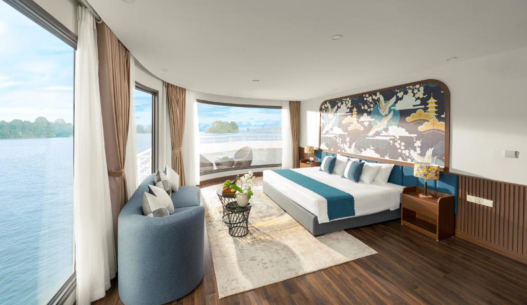 The first and second decks house the guest rooms, all with balconies overlooking the sea, allowing guests to admire the stunning beauty of the bay at any time of day. The rooms are designed in various styles to suit different groups of guests, from couples and families to groups of friends.