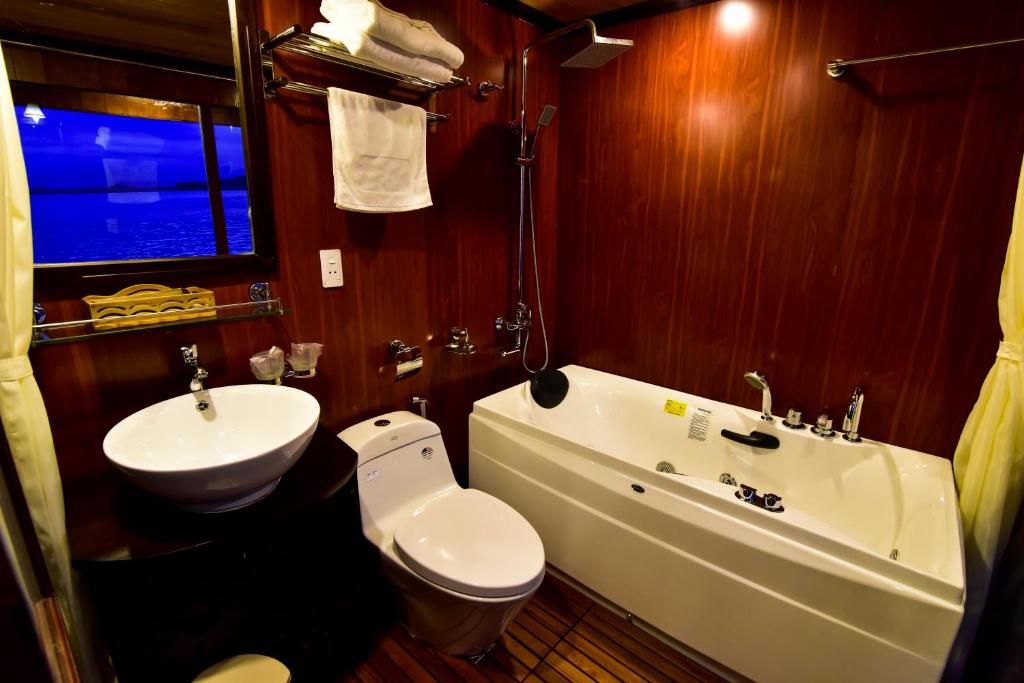 The cruise ship not only has an impressive space but also a system of 11 modernly designed cabins, fully meeting the needs of tourists. The rooms are divided into 3 types: Deluxe, Family Connecting, and Suite Balcony, with interiors made of wood creating a warm and luxurious atmosphere.